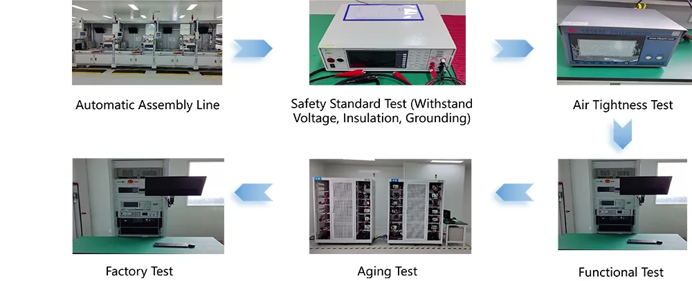 उत्पादनले CCC (चीन अनिवार्य प्रमाणीकरण), CE (युरोपियन युनियन), UL (संयुक्त राज्य अमेरिका), र EN50498 सहित स्वदेश र विदेशमा आधिकारिक प्रमाणीकरणहरू प्राप्त गरेको छ। यसले NB/T33001-2025 र GB31241-2014 मापदण्डहरूको पालना गर्दछ, विद्युतीय सुरक्षा र विद्युत चुम्बकीय अनुकूलता सुनिश्चित गर्दै। हामीसँग आधुनिक उत्पादन आधार छ र V0 रेटिङ र FR-4 फाइबरग्लास PCB बोर्डहरू भएको फ्लेम-रिटार्डन्ट ABS+PC कम्पोजिट मटेरियल हाउसिङ अपनाउँछौं। कुञ्जी सोल्डर जोइन्टहरू वेभ सोल्डरिङ टेक्नोलोजी प्रयोग गरेर प्रशोधन गरिन्छ र 5,000 सम्मिलन/निकासी चक्र, कम्पन प्रतिरोध, र नुन स्प्रे जंग प्रतिरोध जस्ता कठोर परीक्षणहरू पास गरेका छन्। प्रत्येक एकाइले १००% योग्यता दर प्राप्त गर्दै, कारखाना छोड्नु अघि ७२-घण्टा फुल-लोड एजिङ टेस्टबाट गुज्रिन्छ। हामीले एक व्यापक गुणस्तर नियन्त्रण प्रणाली स्थापना गरेका छौं जसले कच्चा माल खरिदबाट समाप्त उत्पादन डेलिभरीमा पूर्ण ट्रेसबिलिटी सक्षम गर्दछ।