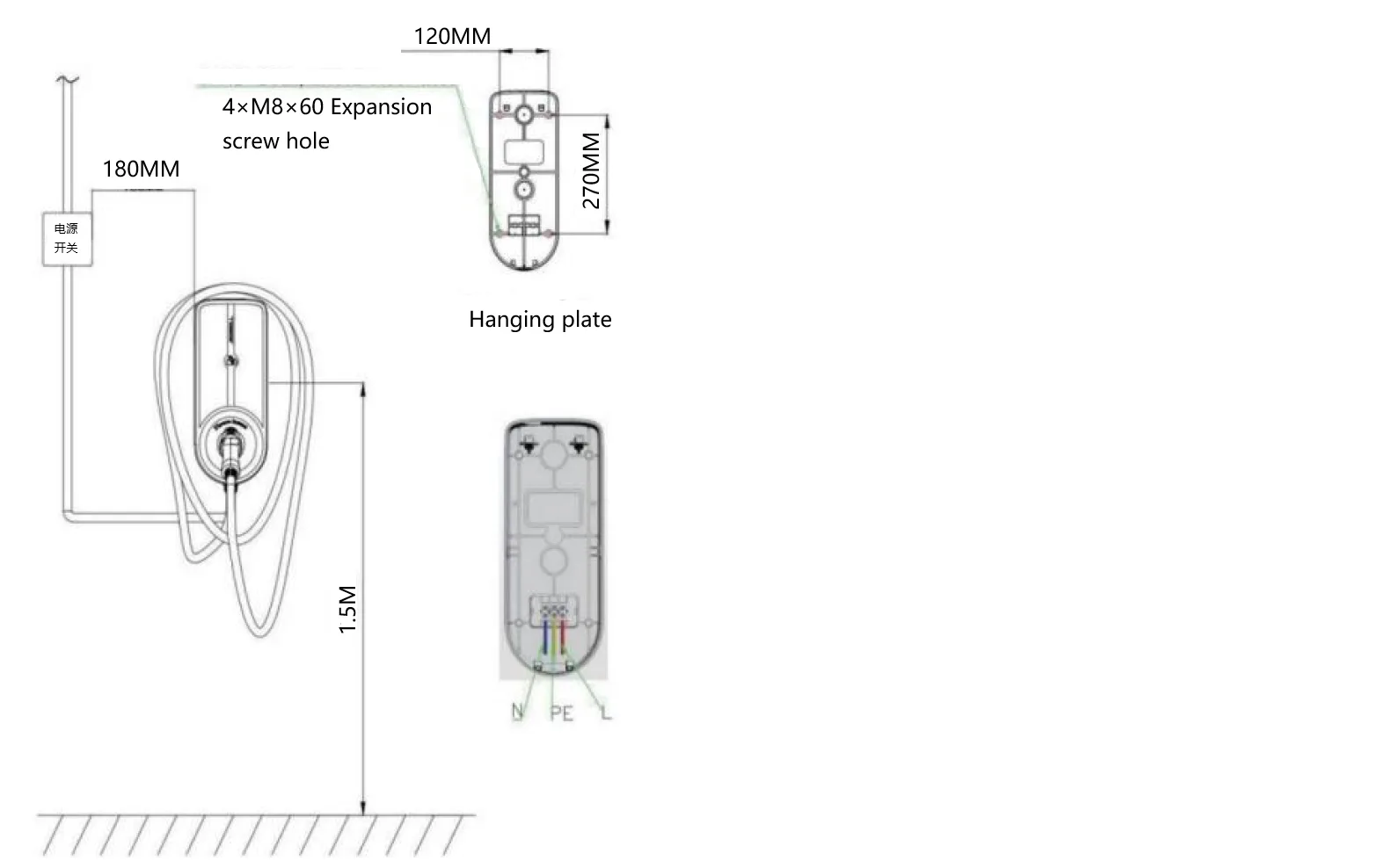1) जमिनबाट चार्जिङ पाइलको उचाइको सन्दर्भ डेटा (1.3-1.5 मिटर) 2) पछाडिको प्लेटमा माउन्टिंग प्वालको स्थिति अनुसार भित्तामा पछाडिको प्लेटमा माउन्टिङ प्वालको स्थिति चिन्ह लगाउनुहोस्।