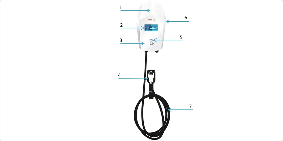 ४. चार्जिङ गन: GB/T २०२३४.२ मानक, ५ मिटर लामो चार्जिङ केबलसँग जोडिएको;